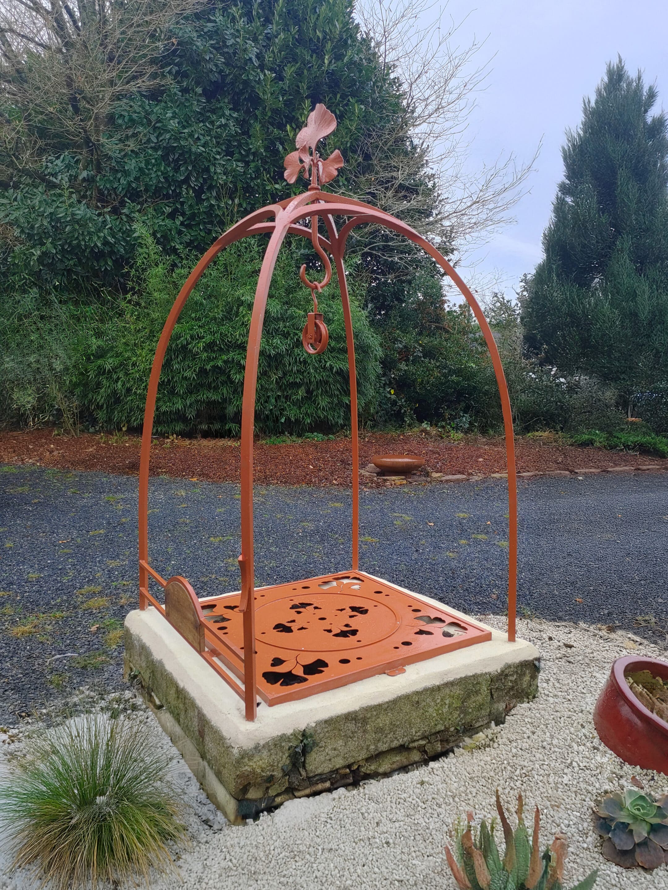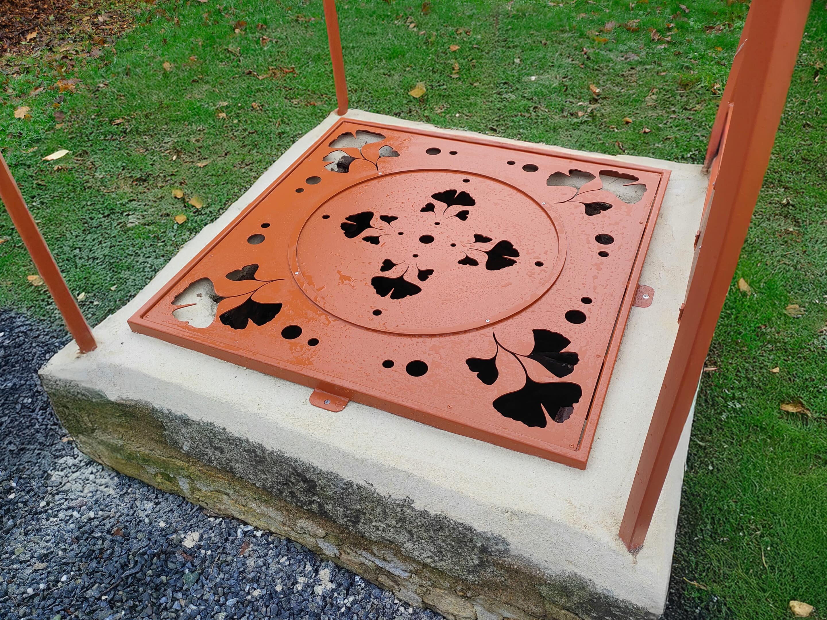 Ferronnerie de puits – forge contemporaine avec feuilles de ginko. Structure 4 pieds & grille tôlée fixe. Pour une maison de Melgven (Finistère – 29).