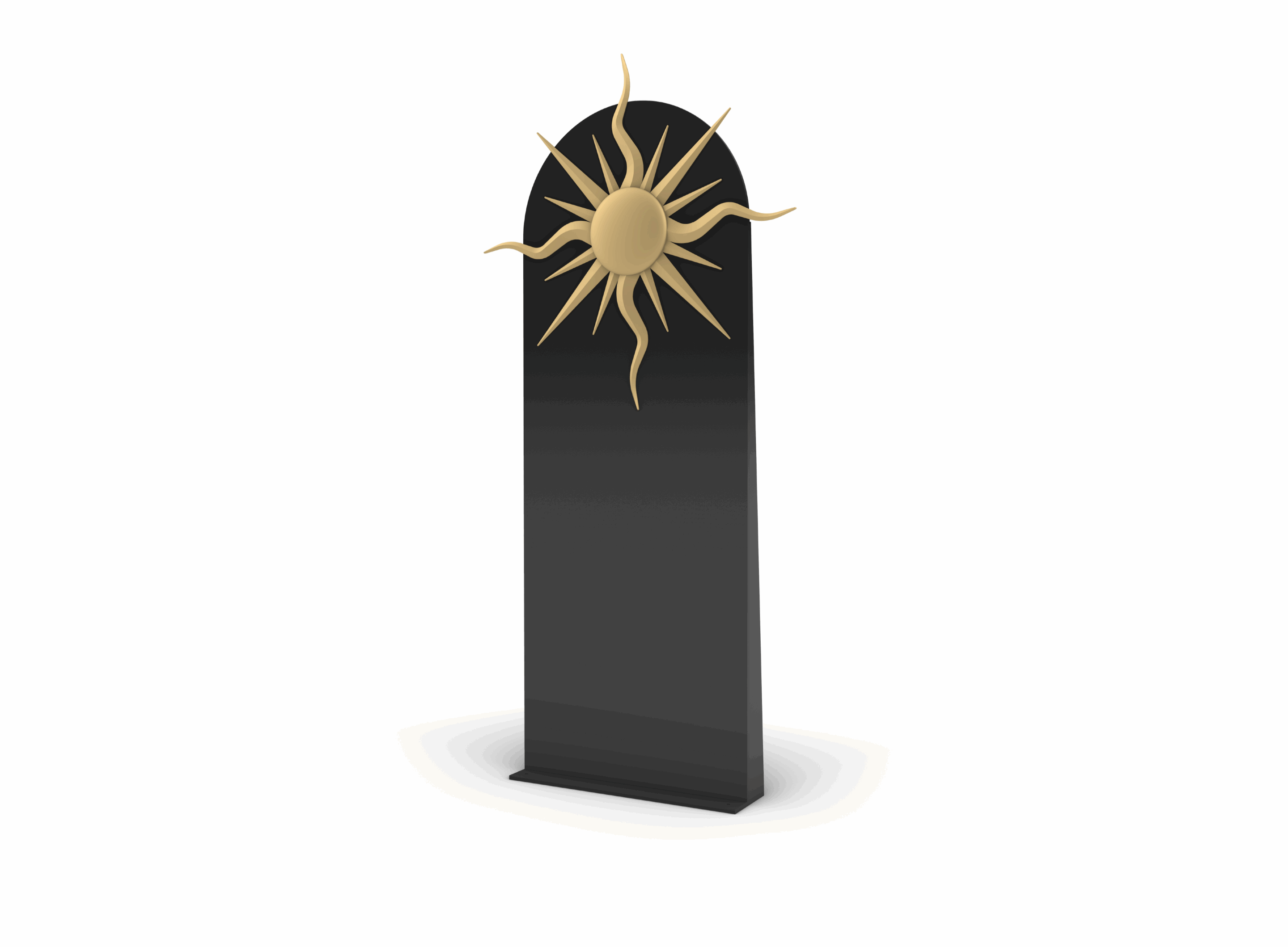 Une grande arche abrite un soleil en relief, inspiré de l’imagerie mystique ancienne.