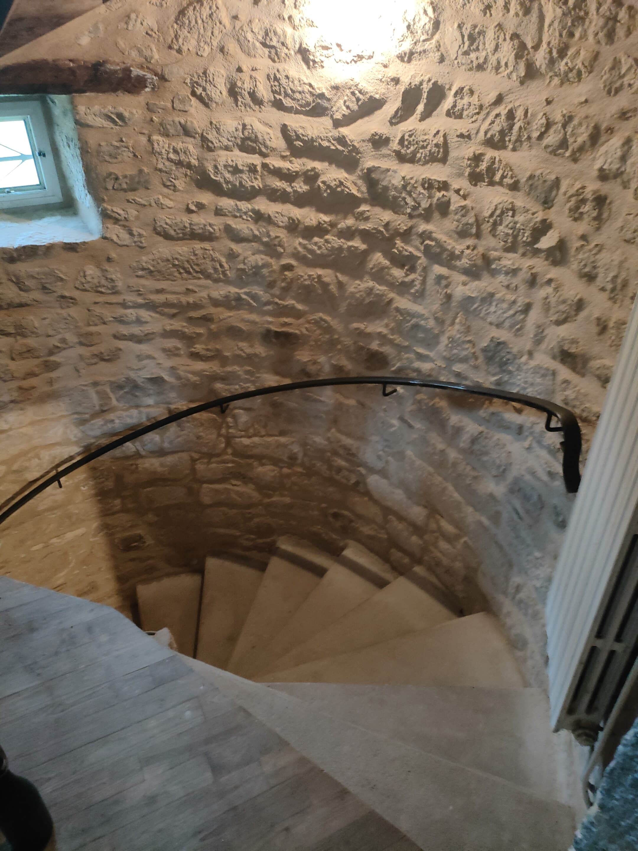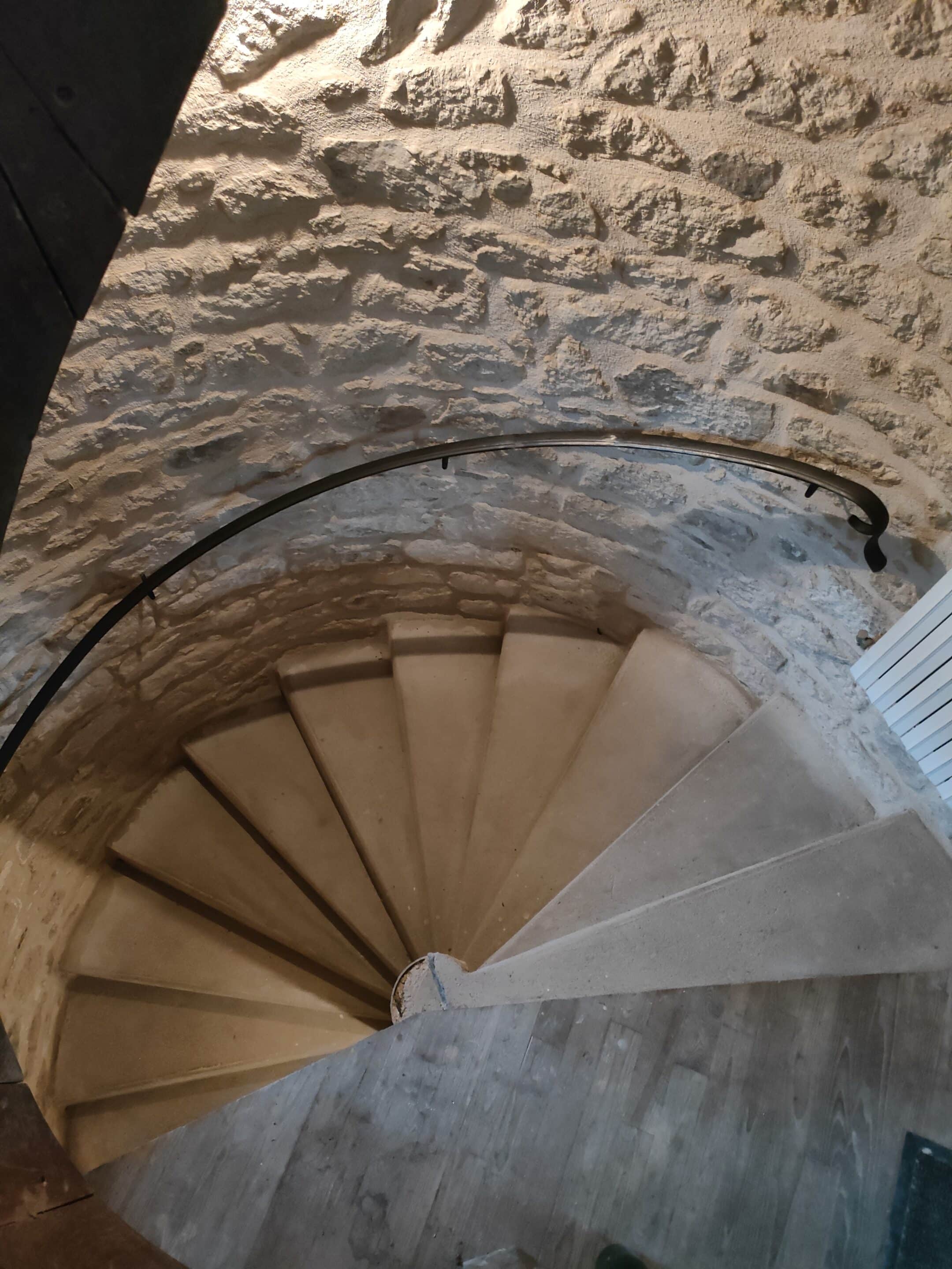 Main-courante Forgée sur place pour coller au plus près du bâtis de la tour. Pour une demeure de Mellionnec (22- Côtes-d’Armor). Fer-forgé naturel.
