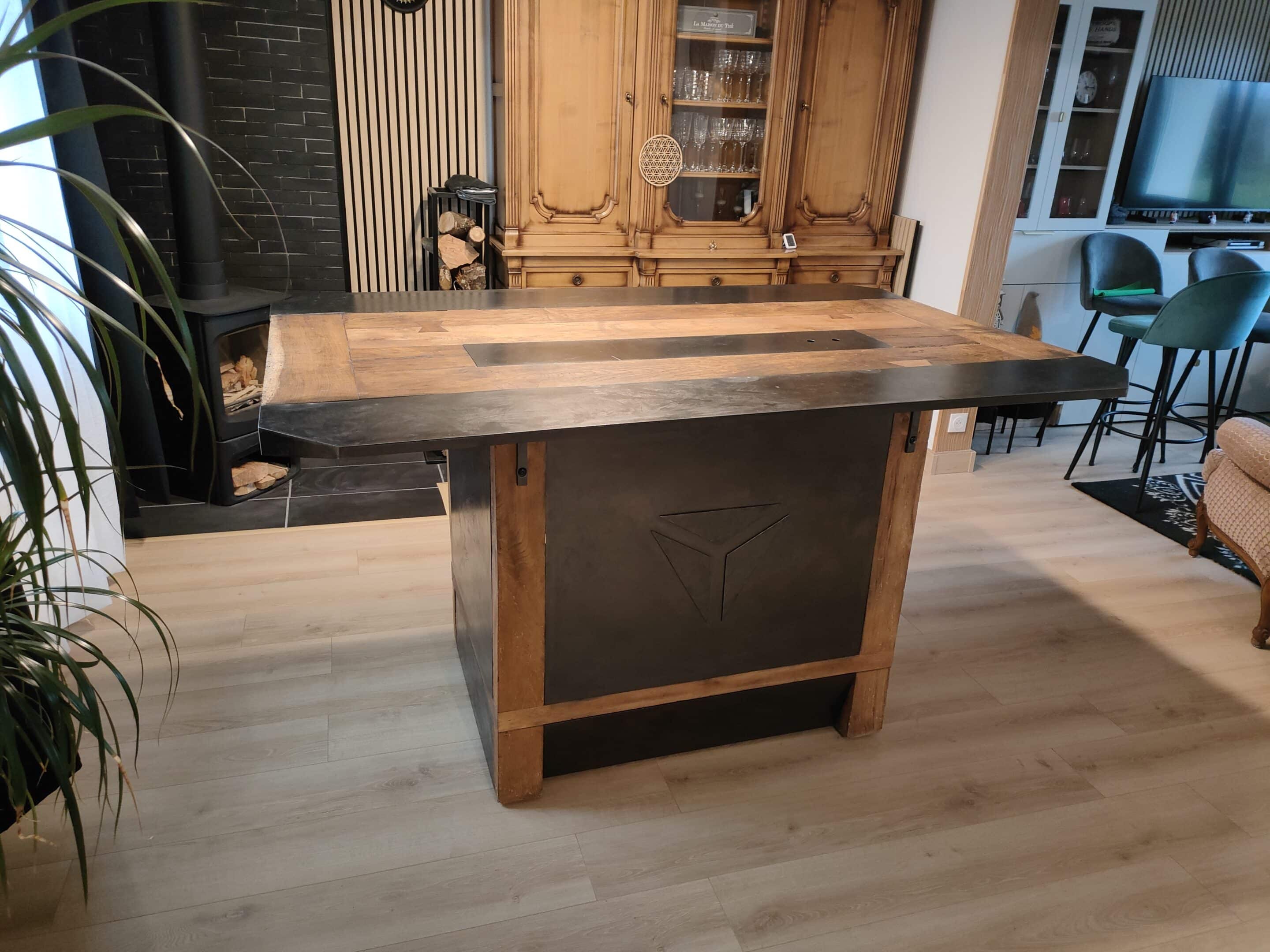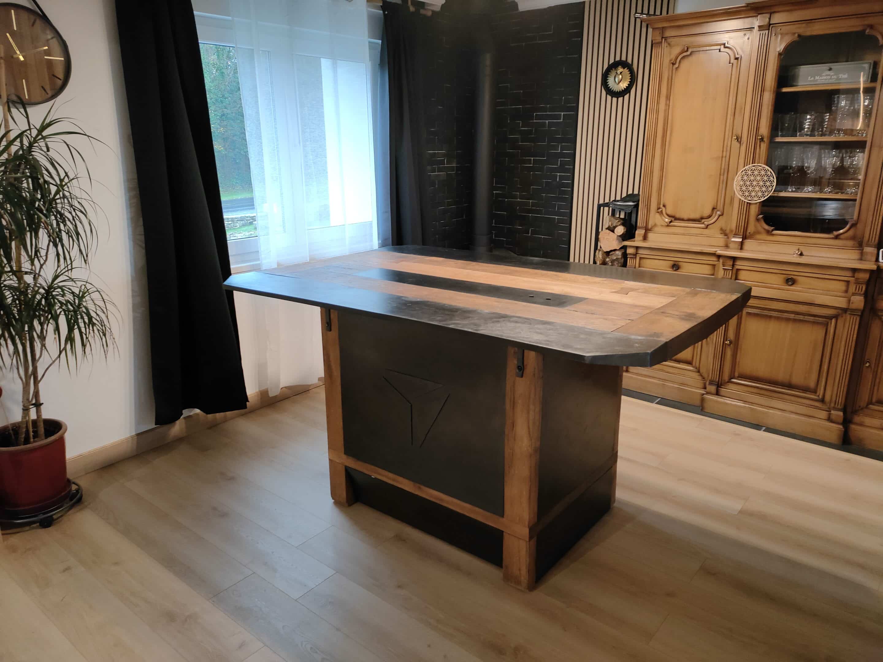 Établis de menuiserie métamorphosé en table à manger. Le chêne et l’acier fusionnent dans une ambiance haut de gamme et chic. Une cache centrale permet de ranger de quoi surprendre vos convives. Des rangement divers sont présents sous la table.